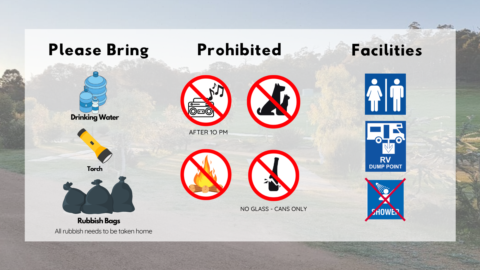 Please be responsible and take out your rubbish. We encourage bringing your own rubbish bags.